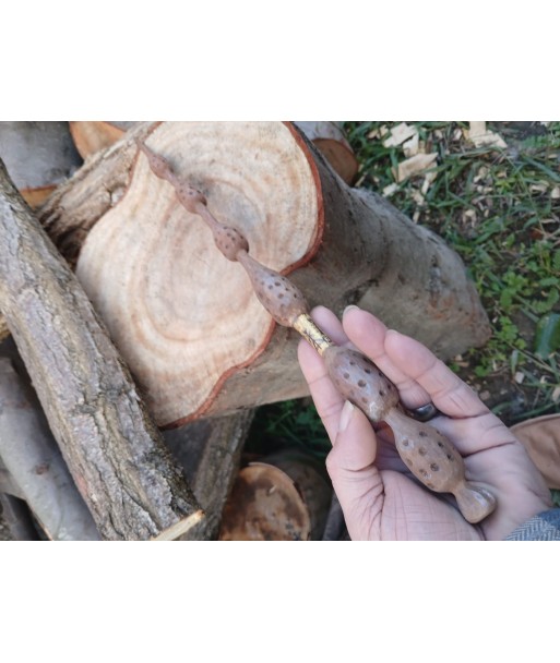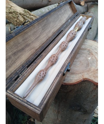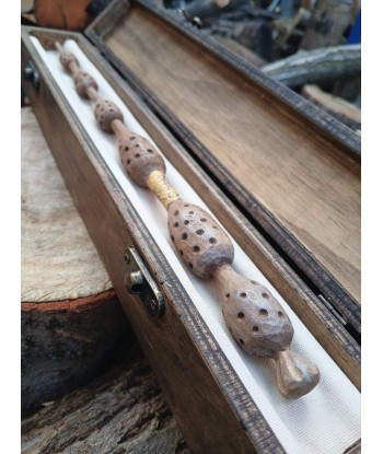 Chaque baguette est sculptée entièrement à la main, dans un bois massif soigneusement sélectionné pour sa vibration, son âge, sa texture et son énergie.